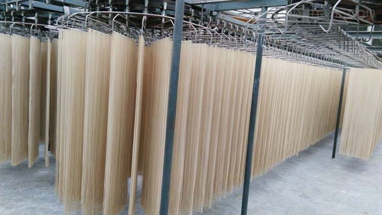 烘烤時間一般控制在8小時至12小時以上。上面的是移動式的面條烘干工藝,對于產(chǎn)量較低的面條烘干項目,可使用間歇批次生產(chǎn)的固定烘干房,但是物料的烘干原則亦可大體參照上述的設(shè)定。